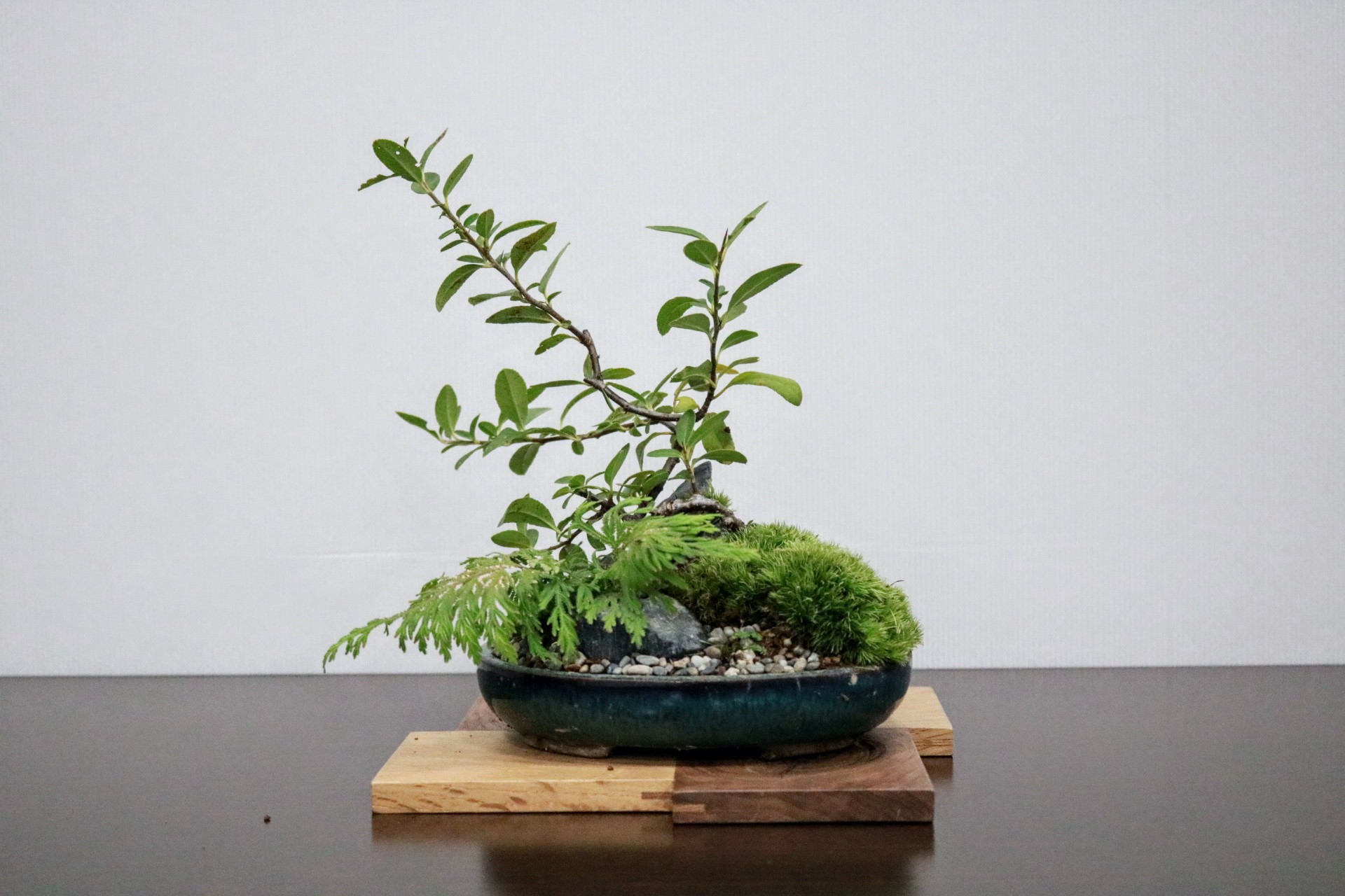 12 cm×16 cmサイズの浅鉢にお好きな木を選んで頂き、景石や苔も置いてミニチュアの世界観をお造り頂けます。